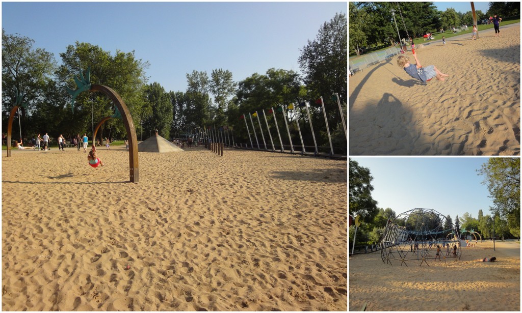Vários playgrounds com brinquedos lindos de madeira e metal para as crainças subirem, escorregarem etc.