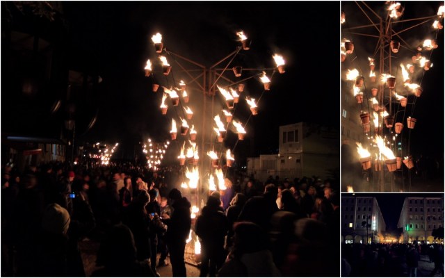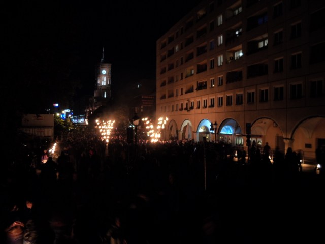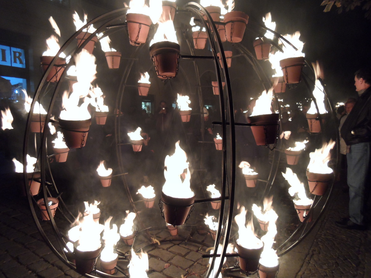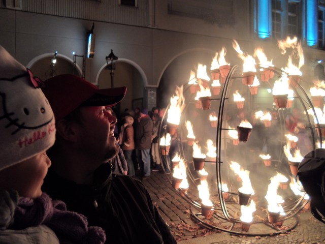 Os “Poetas do Fogo” vindos de Carabosse iluminaram Berlim ao cair da noite de hoje com fascinantes esculturas de fogo. Do Nicolaiviertel até o Schloßplatz, inúmeros jarros de plantas de barro formavam círculos e  altas torres de fogo.
