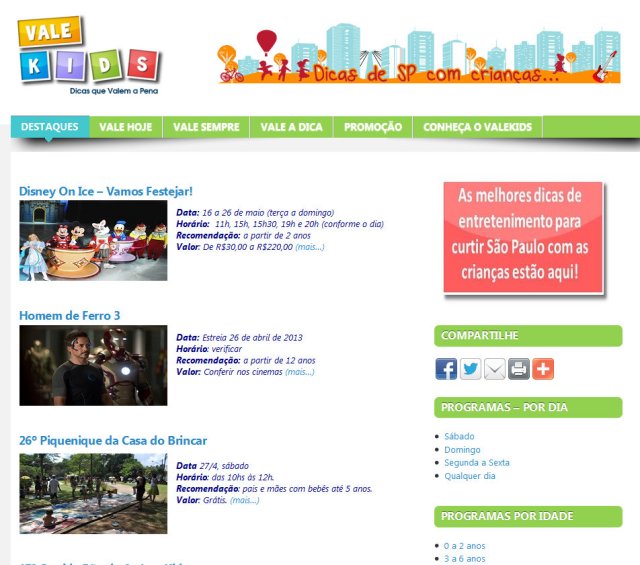 Assim comecei a pensar  no Valekids, que inicialmente  surgiu  da ideia de fazer um clube de compras coletivas, com enfoque em programas culturais só para crianças. O clube não vingou, mas se tornou em algo muito melhor: um guia online de dicas de programas em São Paulo com crianças. No final de 2011, eu e uma ótima amiga chamada Fernanda, organizamos o site para que todos, até aqueles que não entendem nada de internet encontrem exatamente o que procuram.