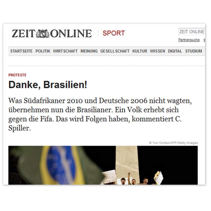 Os sul-africanos em 2010 e os alemães em 2006, não ousaram falar alto, o que o Brasil hoje grita nas ruas. Uma nação se levanta contra a Fifa. Contra corrupção, inflação, mas também contra o padrão imposto pela organização. Construções milionárias de um lado e hospitais caindo aos pedaços de outro. Se é para ser no padrão Fifa, que não sejam somente os estádios, mas que sejam também as escolas, o sistema de transporte público, as ruas e rodovías. Brasil diz chega! Nós dizemos: Obrigado Brasil!”