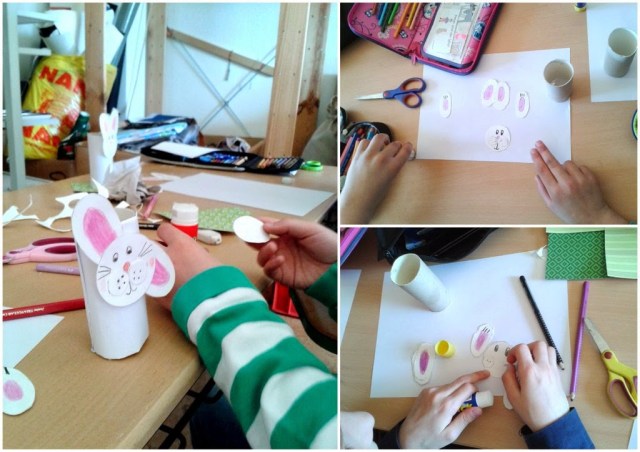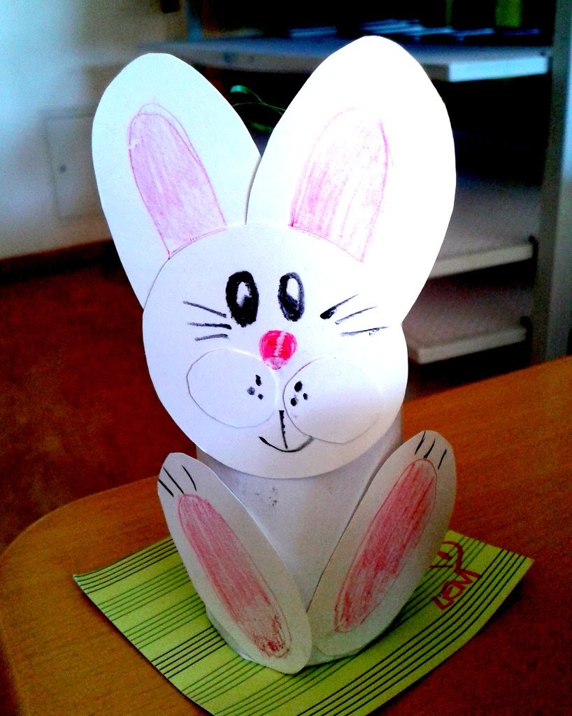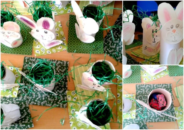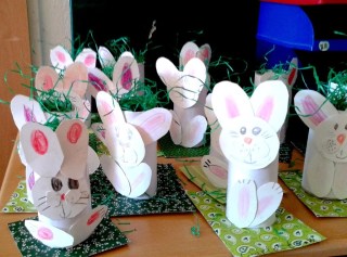 Hoje fui convidada para dar uma aulinha de trabalhos manuais na escola do meu filho com o tema reciclagem. Escolhi o tema “reutilizando um rolo de papel higiênico” e foi um sucesso! Foram 24 coelhinhos da páscoa feitos pelas próprias crianças.