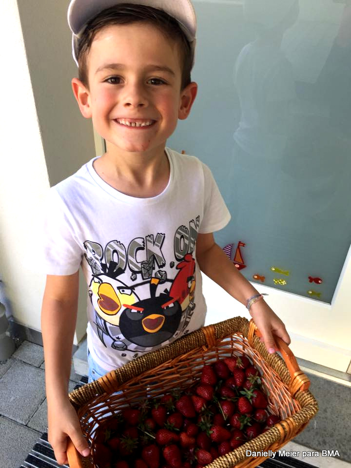 “As fotos fizemos em Allschwil – Baselland. Mas existem outros lugares e não é somente para colher morangos. Você pode colher framboesa e flores também. Nesse que fomos, você vê já antes de chegar em Allschwil, as plaquinhas indicando o caminho. A única coisa que você precisa levar é uma vasilha. Lá eles pesam a vasilha, e você pode colher e comer à vontade. Você só paga o que colheu e não o que comeu! O quilo custa 5 francos suíços. Depois de colher o que quiser, é só voltar na balança para pesar e descontar o peso da vasilha. Prontiho! Um programa muito legal e uma atividade interessante e divertida.”