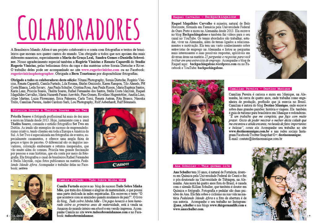 A Brasileiros Mundo Afora é feita por nós e por vários colaboradores, que moram nos quatro cantos do mundo, o que faz dela um projeto muito especial e único. Nossas revistas são prova do poder do trabalho coletivo e colaborativo, valores em que acreditamos e que colocamos em prática. Impossível publicar todo o conteúdo fantástico produzido por brasileiros que moram mundo afora. Escolhemos então algumas histórias, fotografias e dicas que nos encantaram.