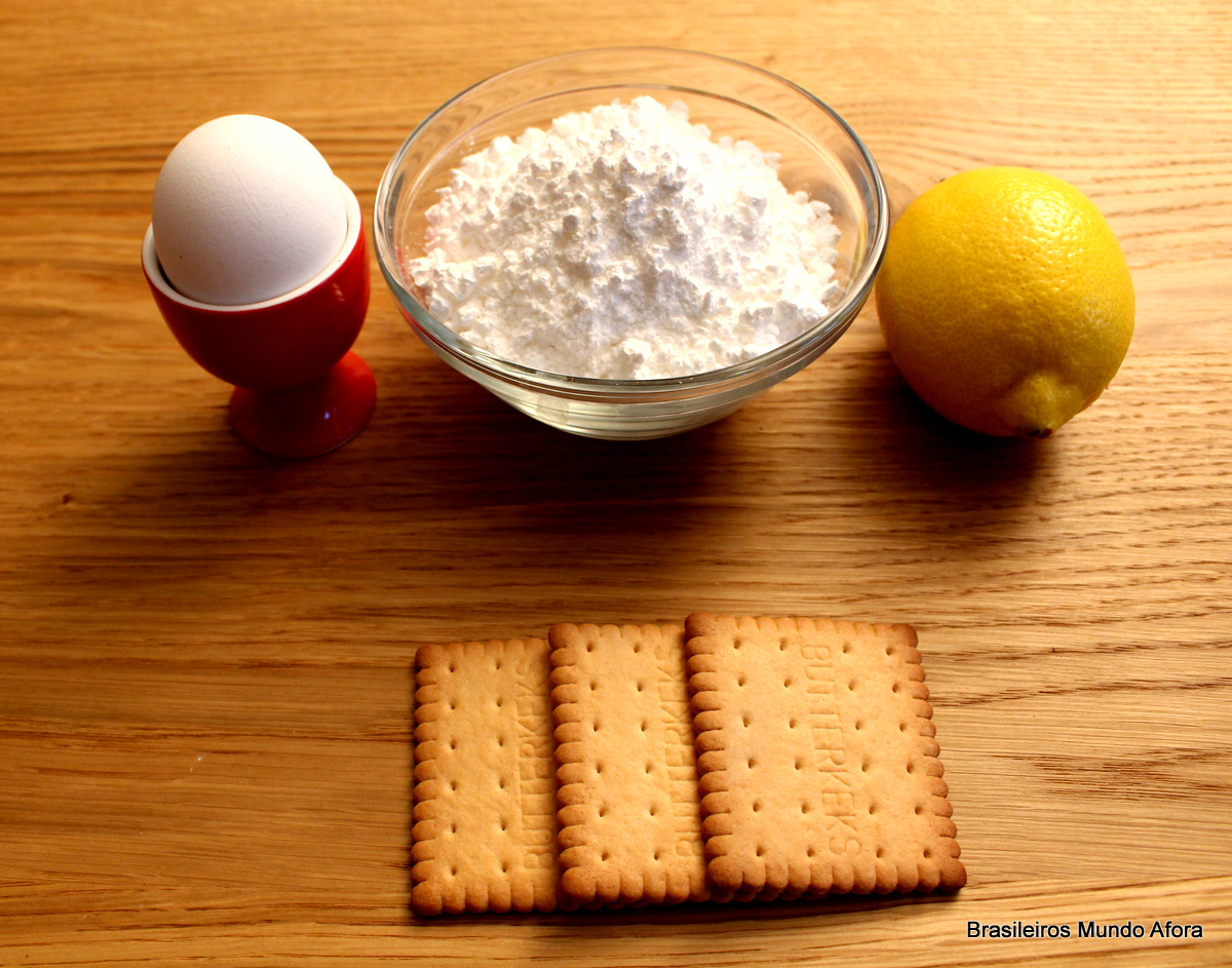A preparação do glacê: coloque em uma tigela o açúcar, o suco de limão, a clara de ovo e acrescente a água devagar. Pode ser que você precise colocar uma colher a mais ou a menos até a mistura formar uma pasta consistente. Com o glacê pronto, você poderá “colar” os biscoitos um no outro.
